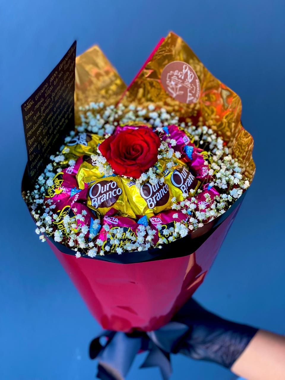 1 rosa e 14 bombons sonho de valsa ou ouro branco (acompanha bilhete personalizado gratuitamente desde que solicitado expressamente pelo cliente no ato da encomenda)