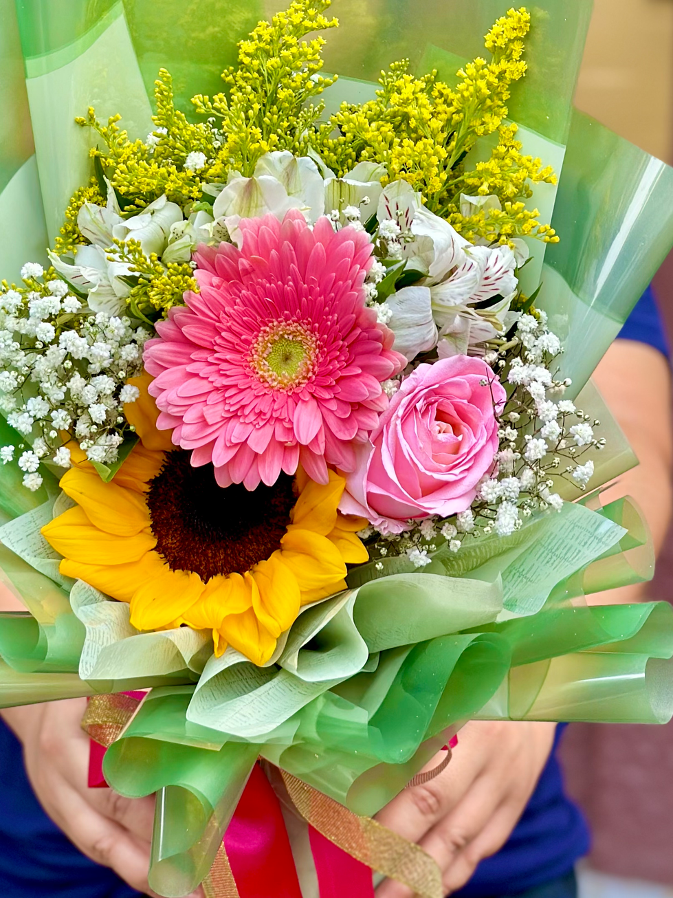 1 rosa 1 gérbera e 1 girassol e folhagens complementares (acompanha bilhete personalizado desde que solicitado expressamente pelo cliente)
